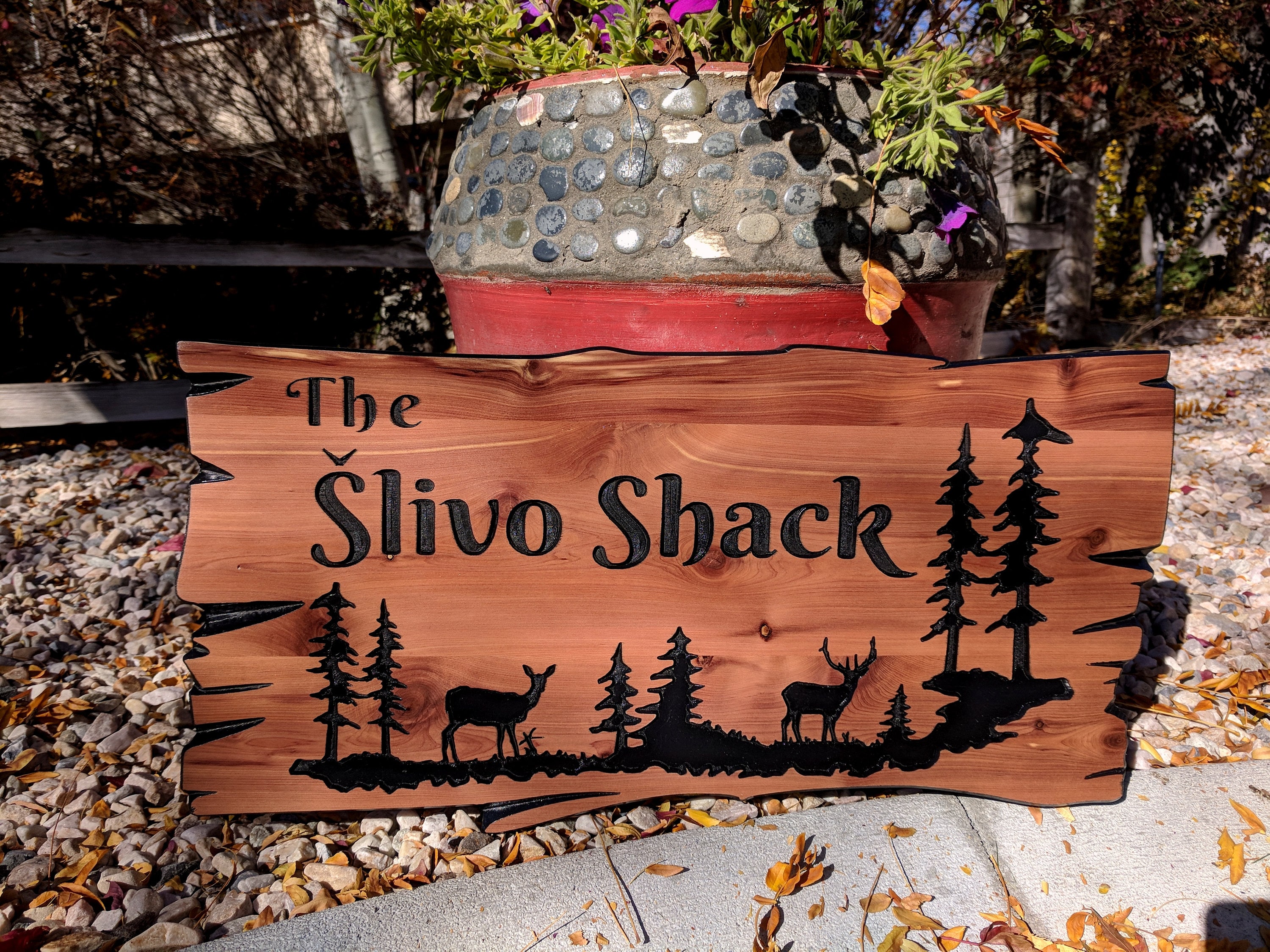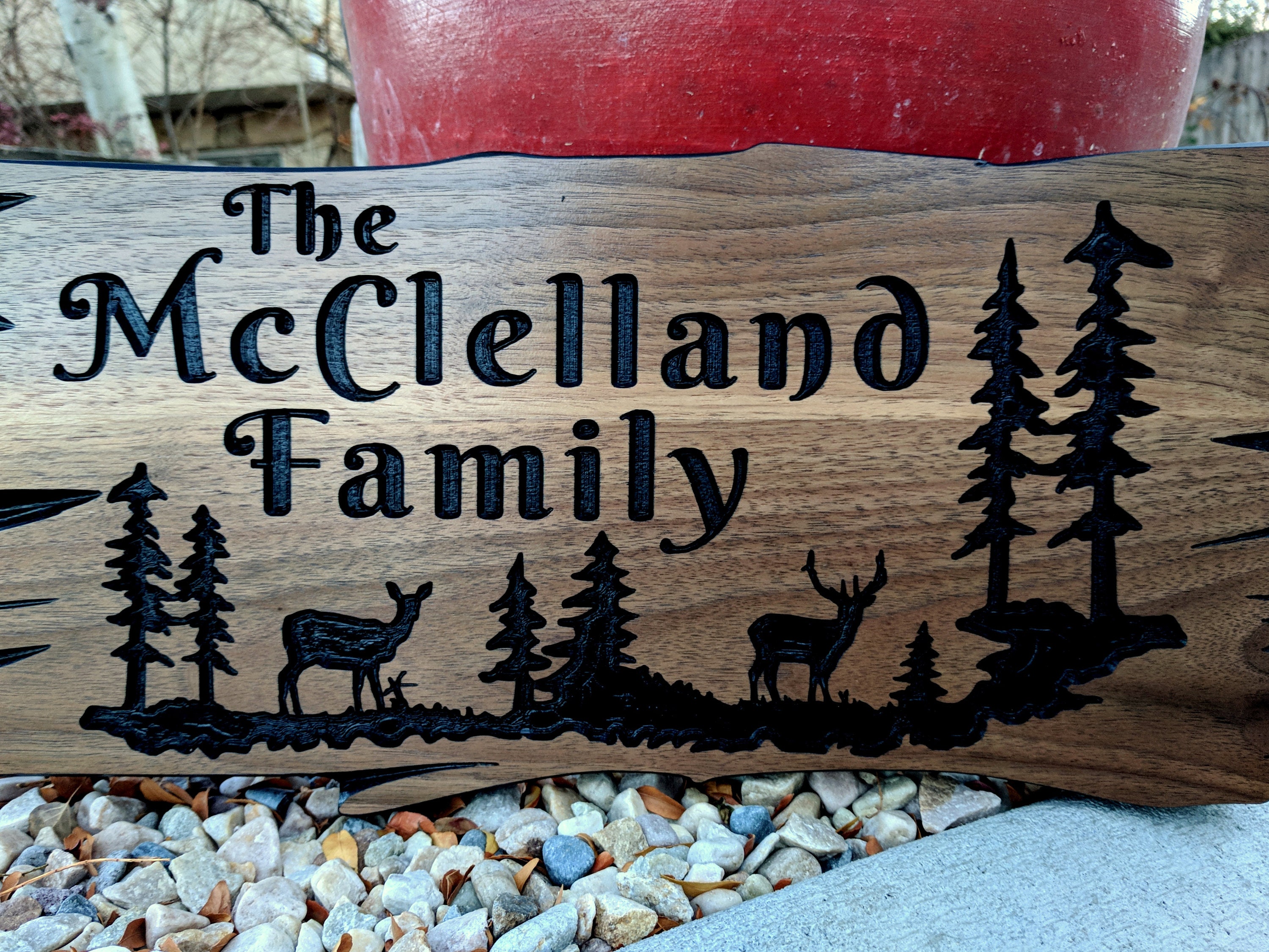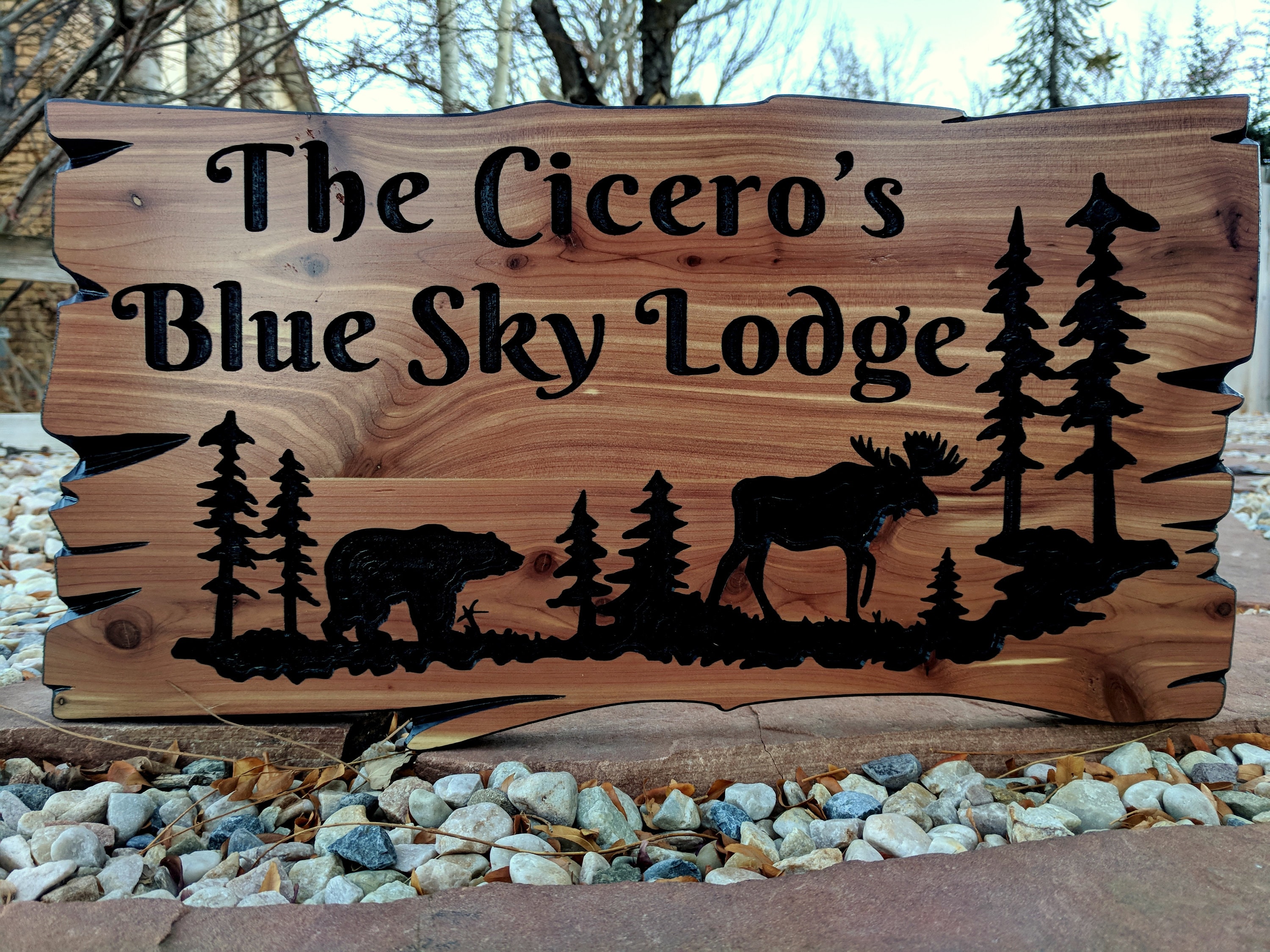 This sign can be made in sizes 17x9, 20x11 or 23x12. The sign has your custom wording carved into the sign, along with a Pine Tree and Elk Scene as well as an attractive driftwood border. The carved portions are painted black or off-white upon request. Custom images are available upon request.