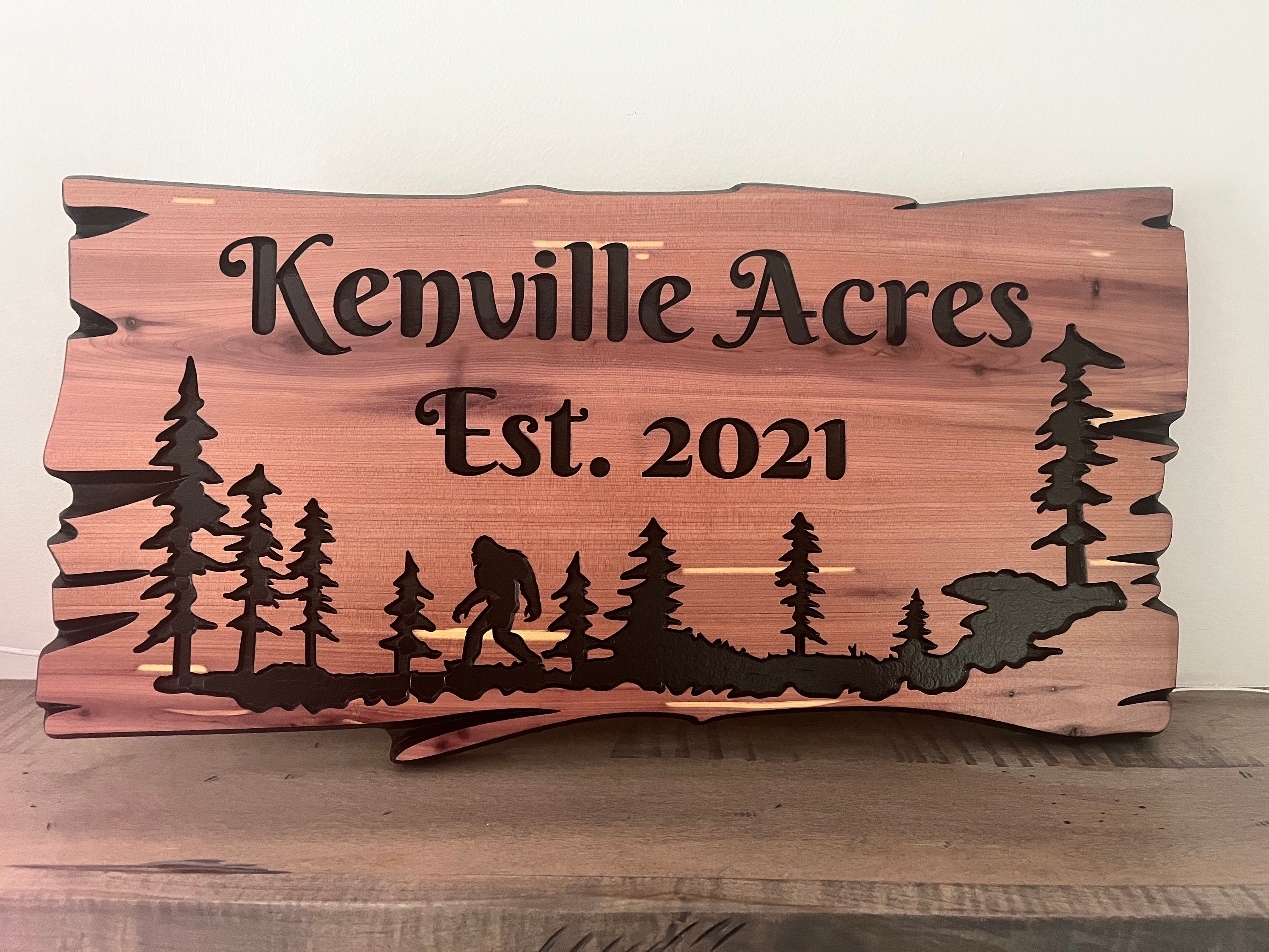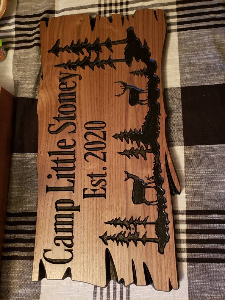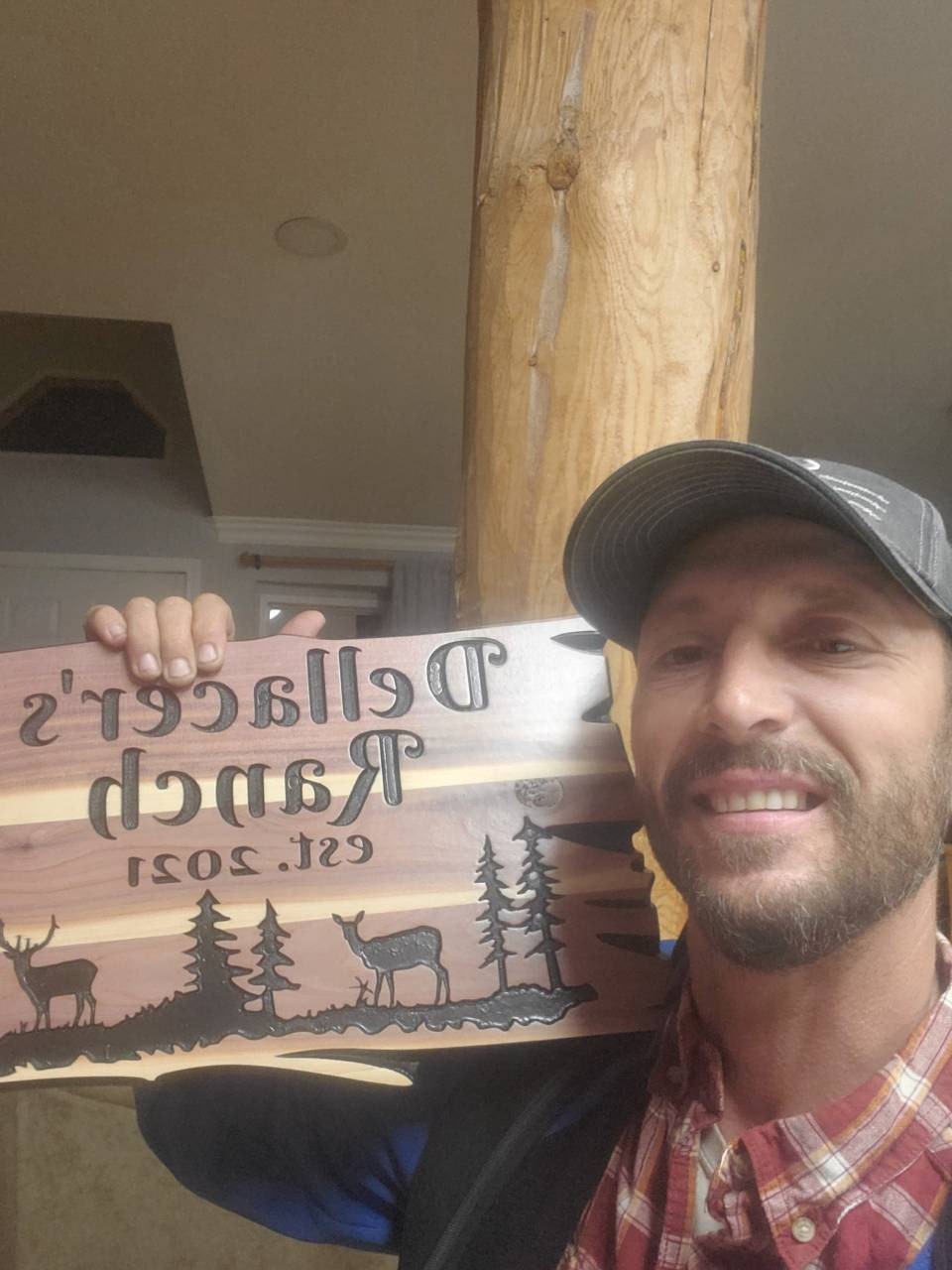 This sign can be made in sizes 17x9, 20x11 or 23x12. The sign has your custom wording carved into the sign, along with a Pine Tree and Elk Scene as well as an attractive driftwood border. The carved portions are painted black or off-white upon request. Custom images are available upon request.