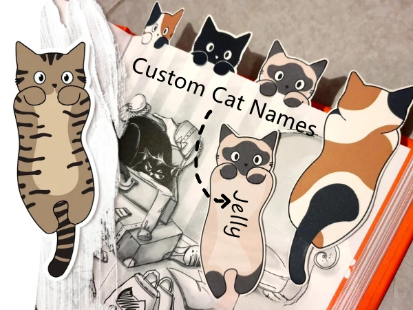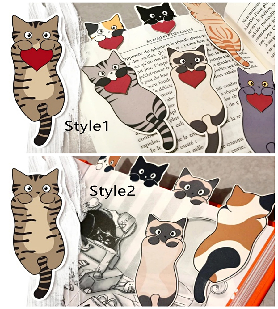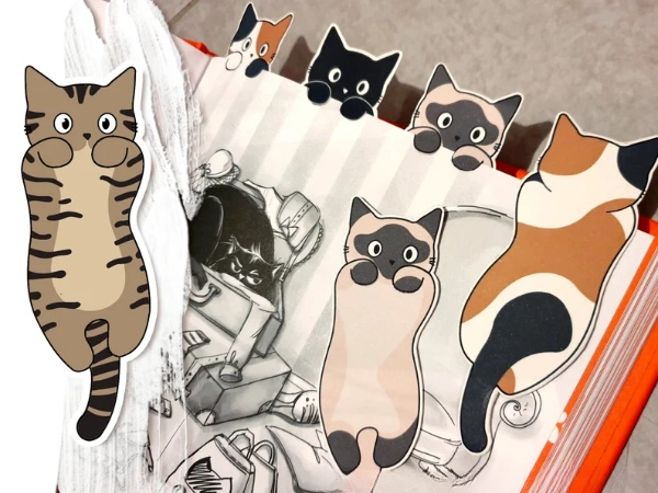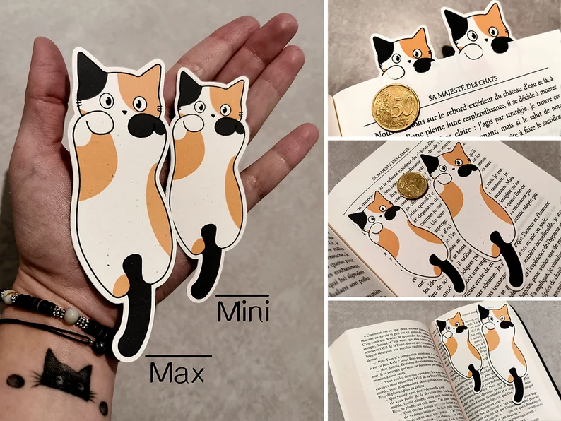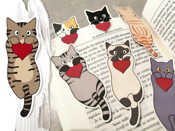 We make these bookmarks entirely by hand (from the design of the little cats to their cutting and assembly).