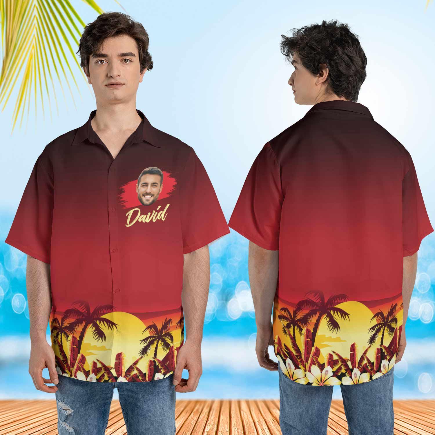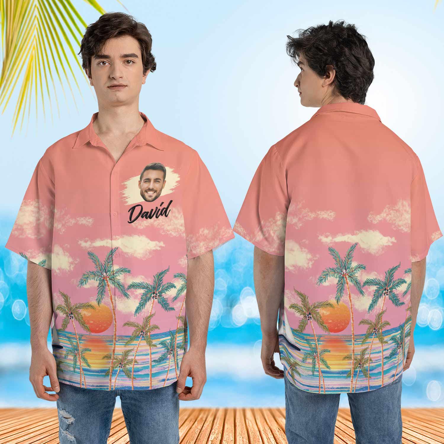 Turn your photo or a loved one’s into a playful and personal touch on your Hawaiian shirt.