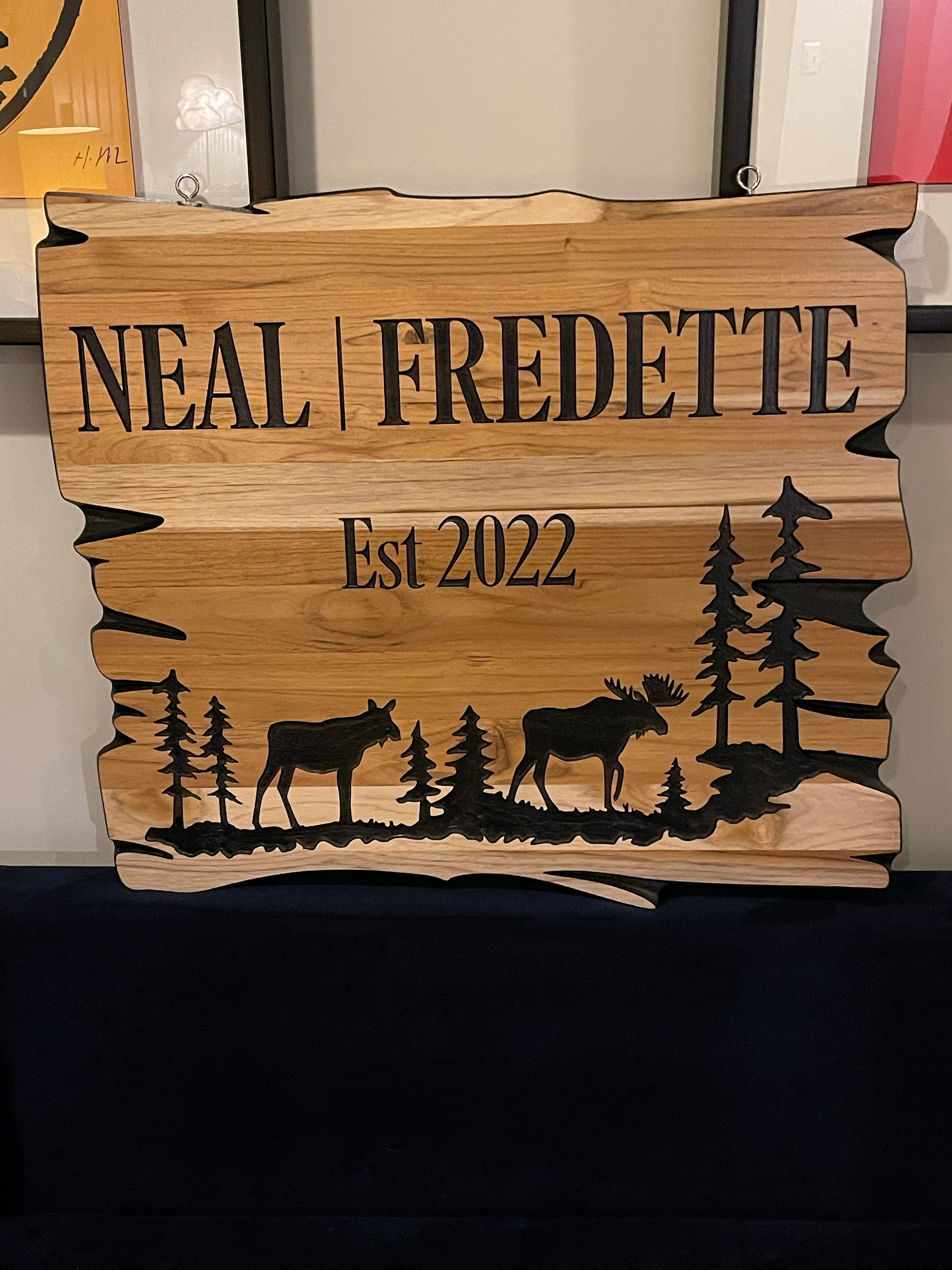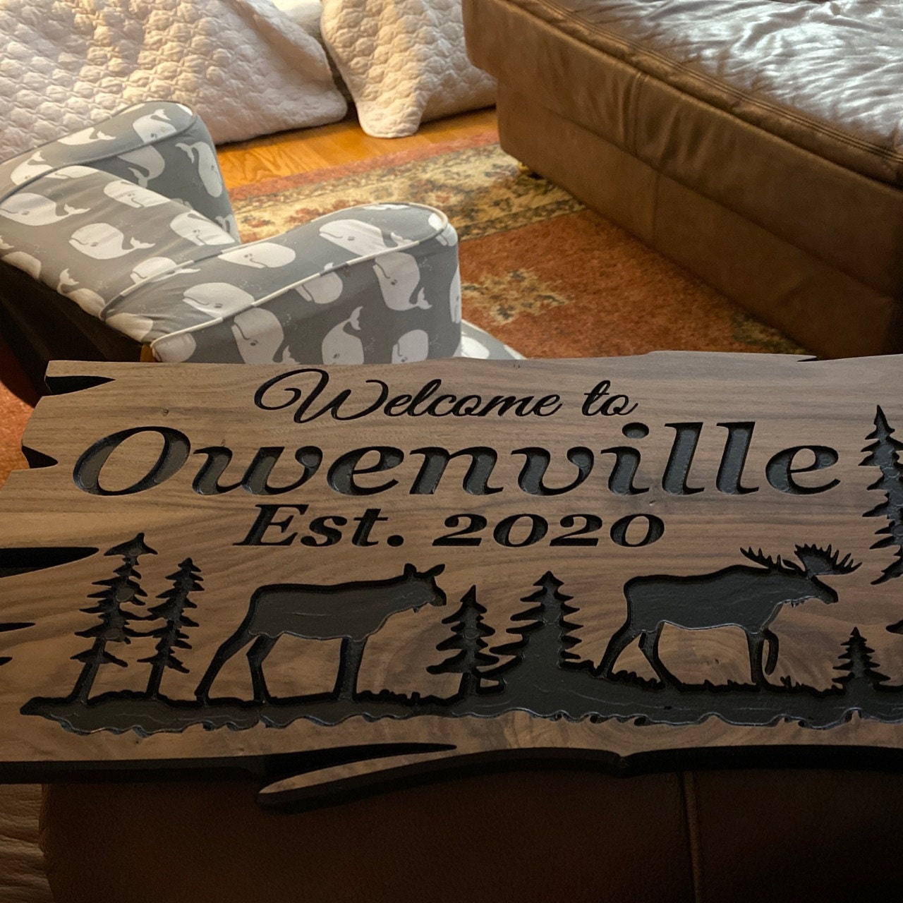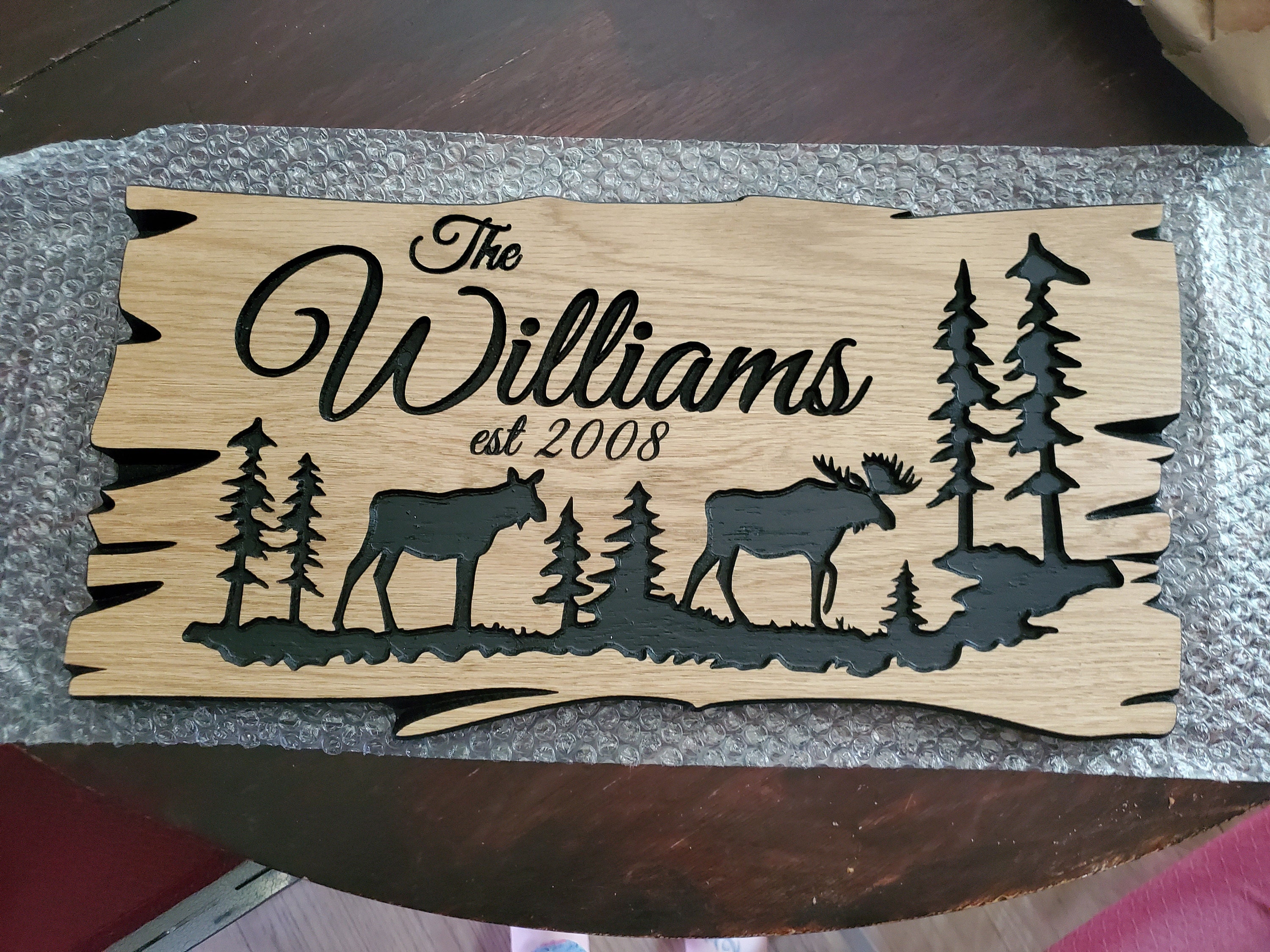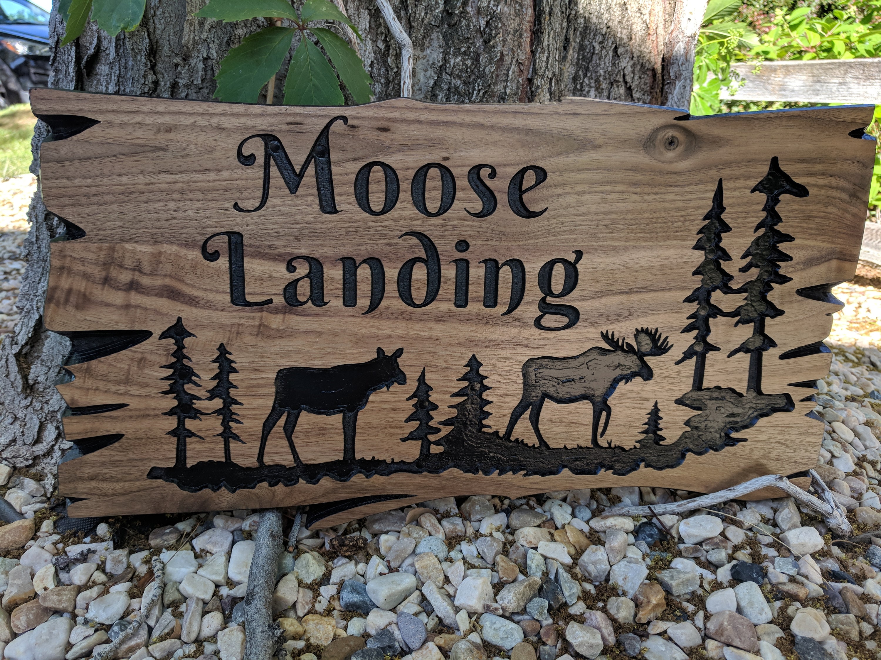 This sign can be made in sizes 17x9, 20x11 or 23x12. The sign has your custom wording carved into the sign, along with a moose and pine tree scene as well as an attractive driftwood border. The carved portions are painted black or off-white upon request. Custom images are available upon request.