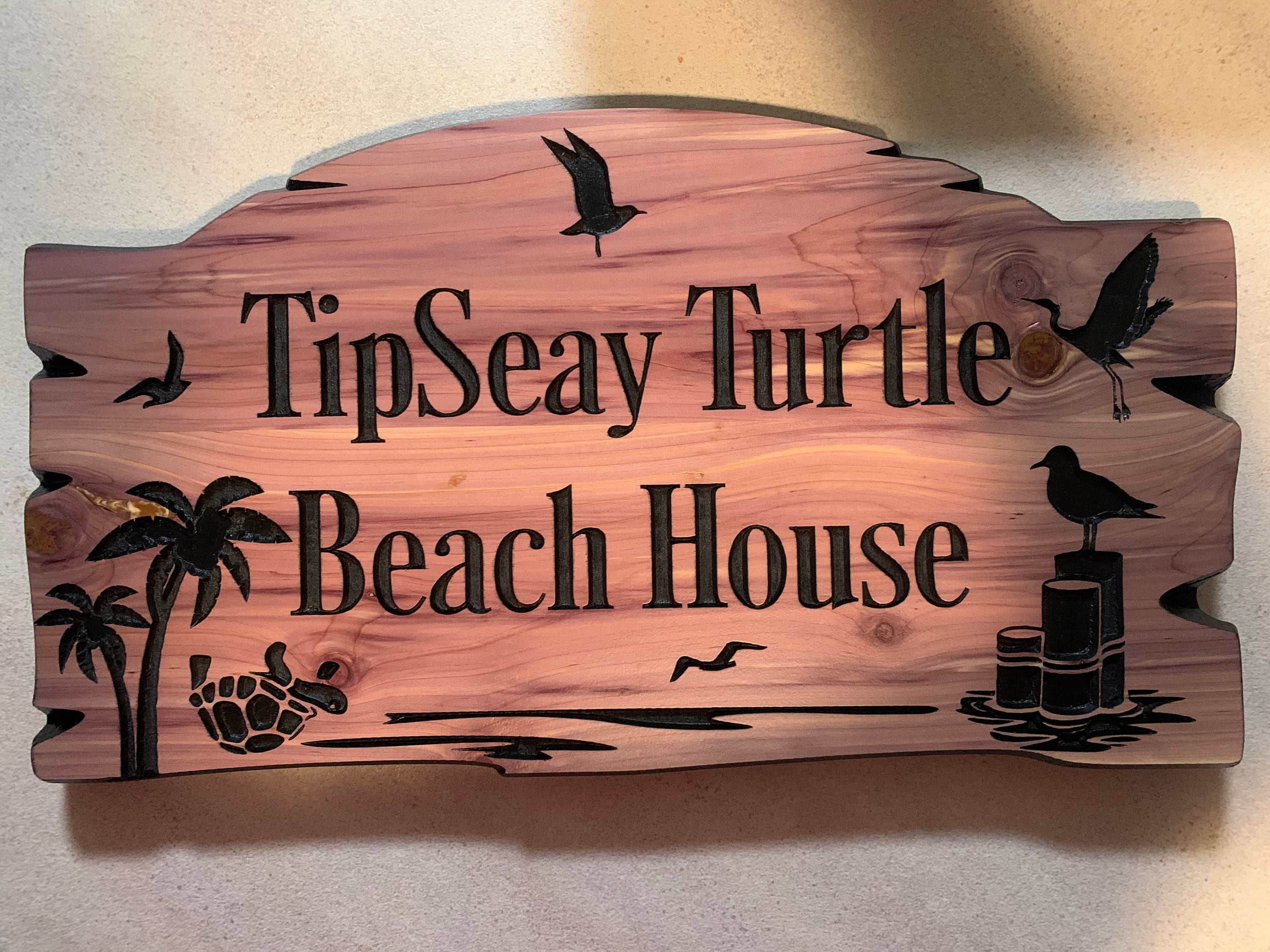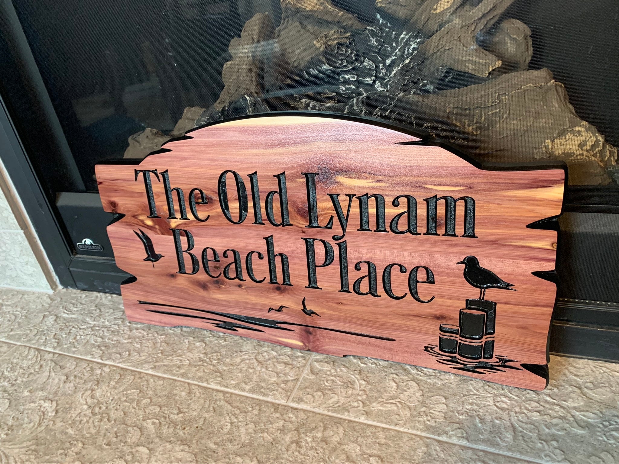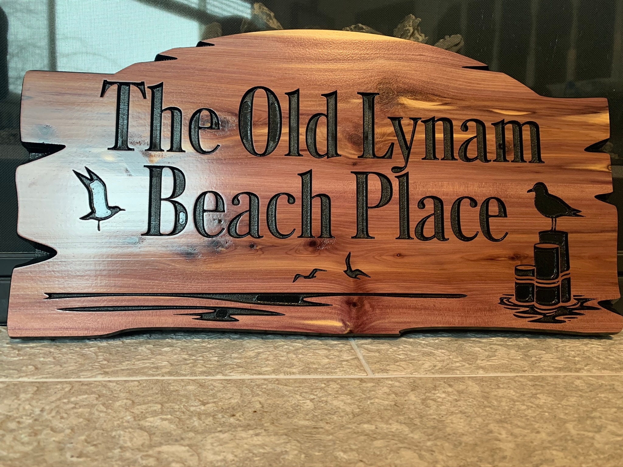 This sign can be made in sizes 17x9, 20x11 or 23x12. Please contact me for larger sizes. The sign has your custom wording carved into the sign, along with a helm and anchor to give it a beach feel as well as an attractive driftwood border. The carved portions are painted black or off-white upon request. Custom images are available upon request.