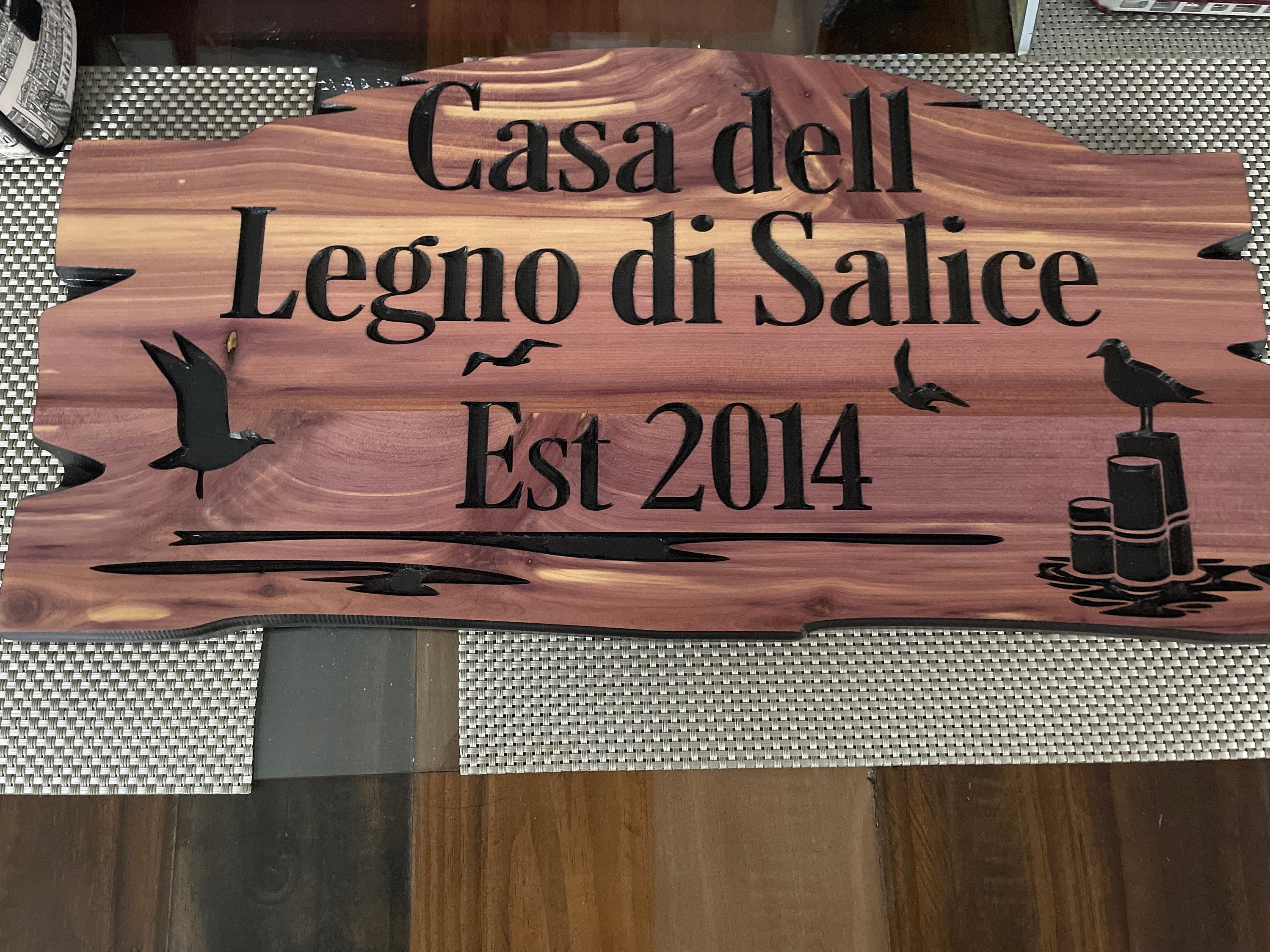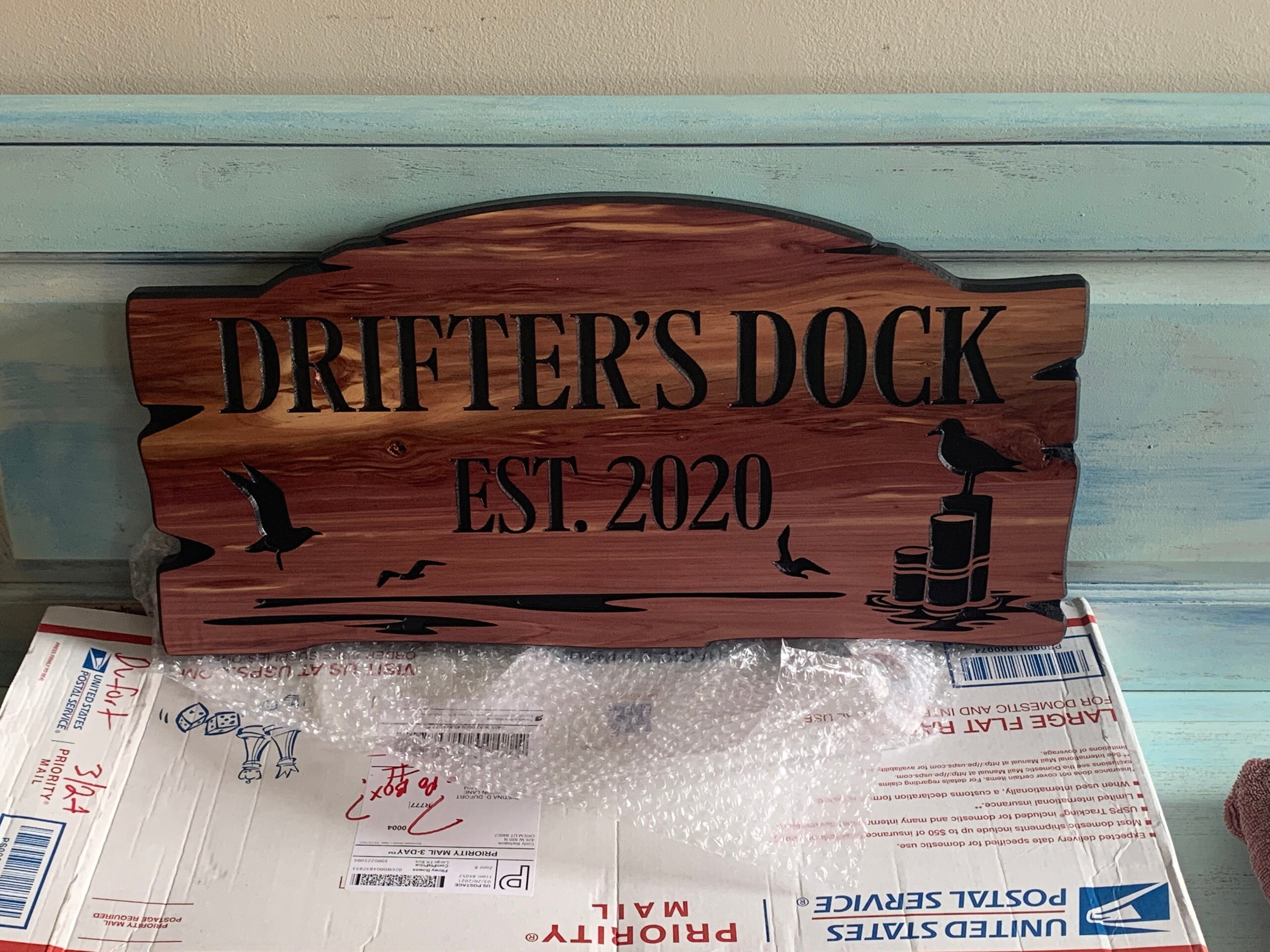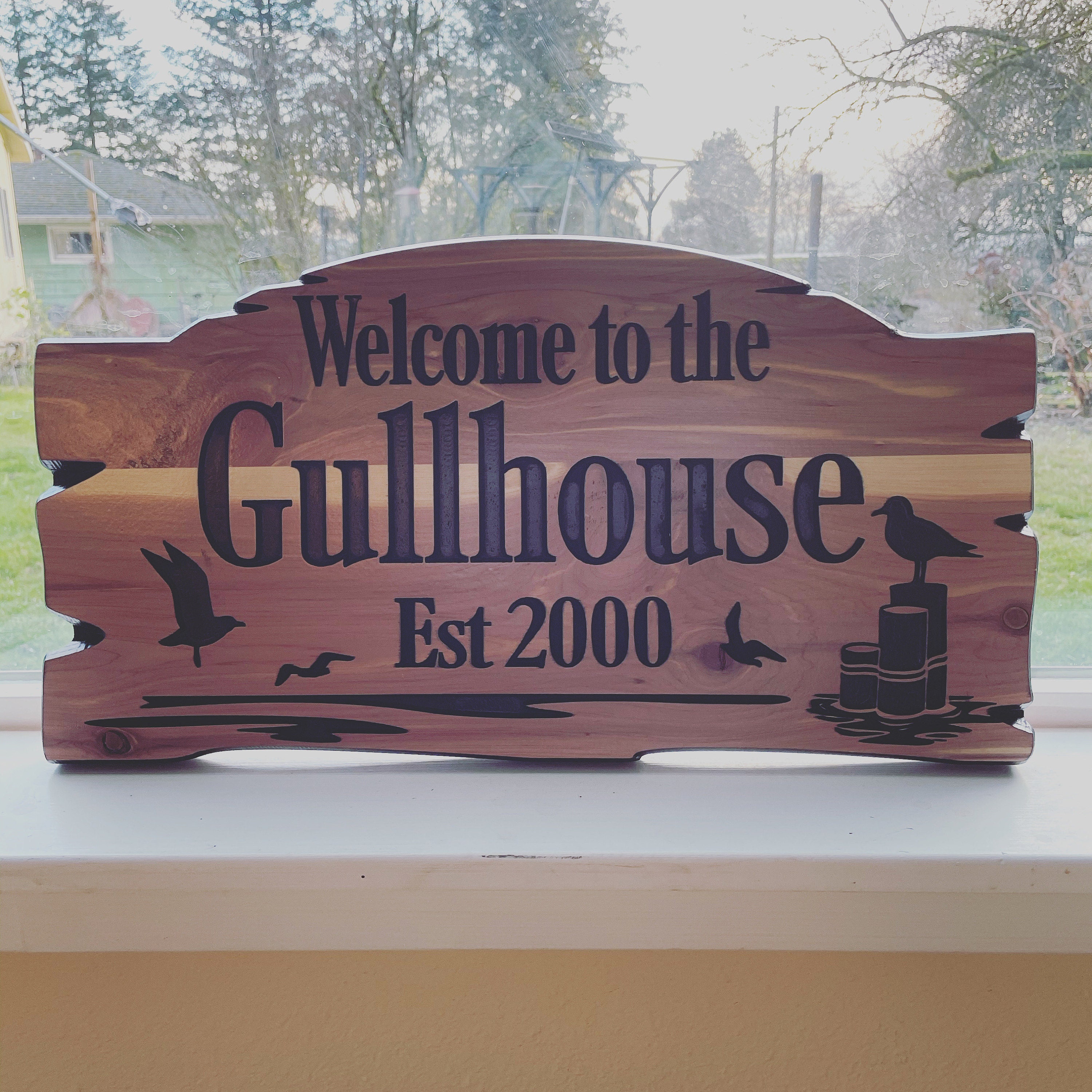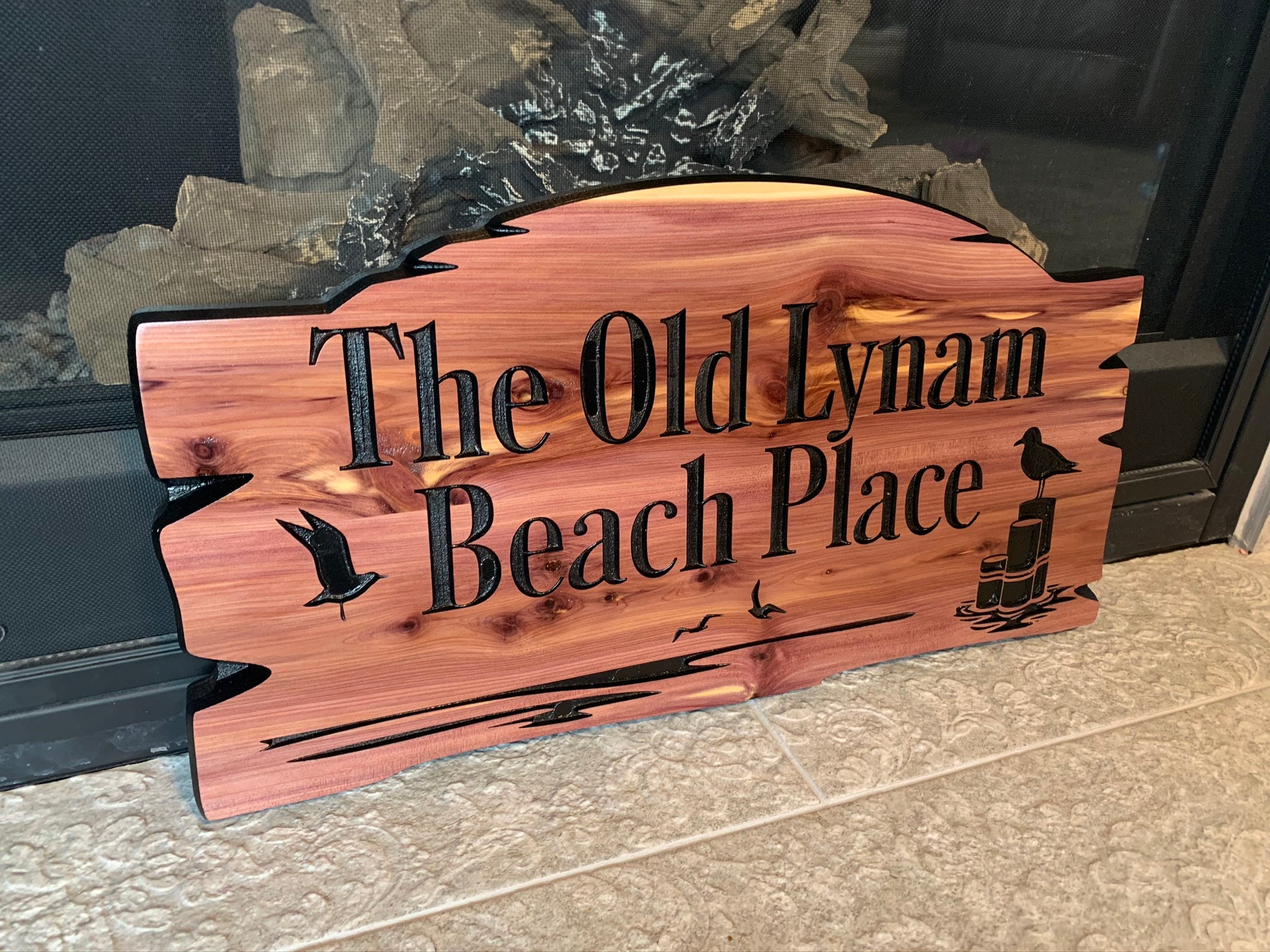 This sign can be made in sizes 17x9, 20x11 or 23x12. Please contact me for larger sizes. The sign has your custom wording carved into the sign, along with a helm and anchor to give it a beach feel as well as an attractive driftwood border. The carved portions are painted black or off-white upon request. Custom images are available upon request.