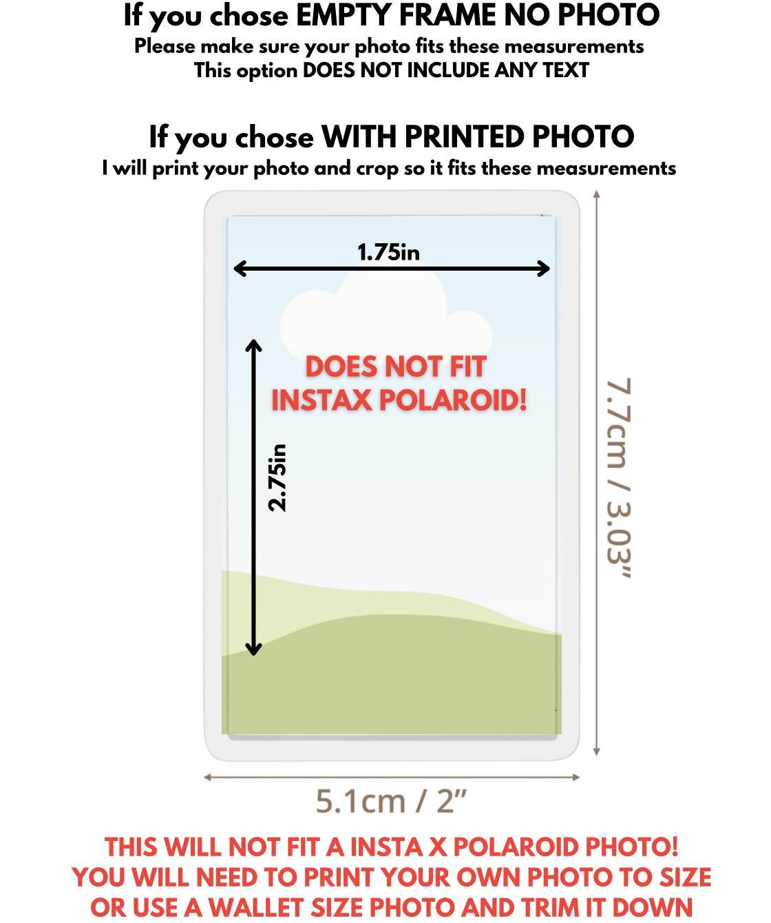 - Photo Insert Size: Fits photos sized 1.75 x 2.75 cm (may require cropping for a perfect fit).