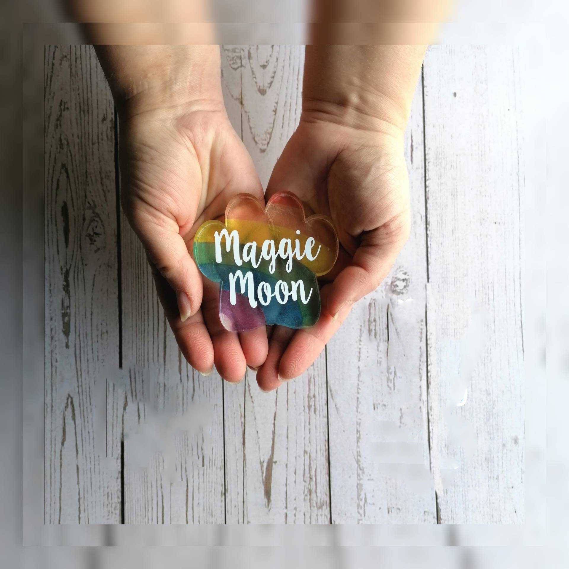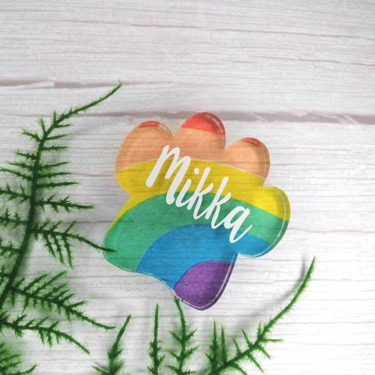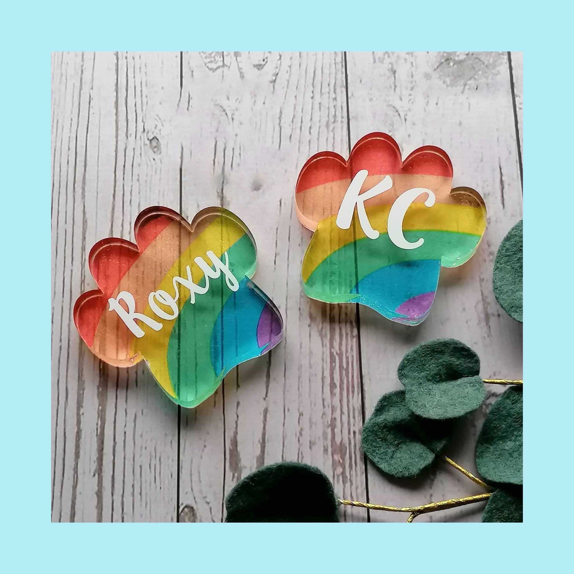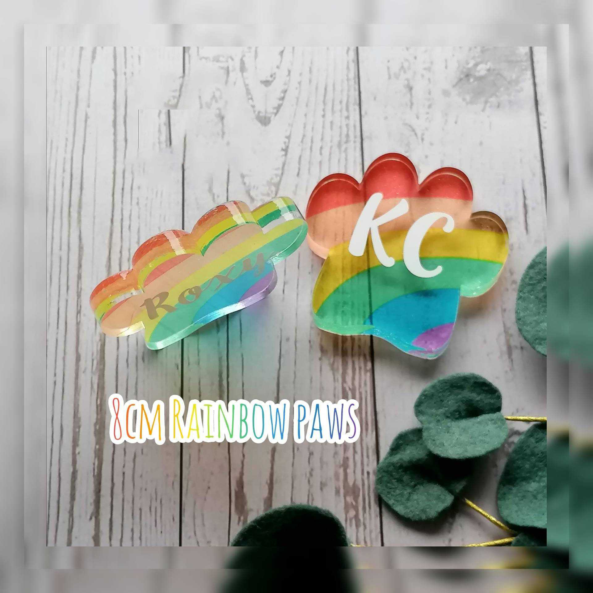The paw is made from cast acrylic which will be reverse decoupaged with a rainbow paper and sealed with a gloss finish on the decoupage side for added protection. The pets name/s will then be cut from a gloss white vinyl and applied to the non decoupaged side. . Due to this being a decoupaged item, placement of the paper may differ as shown in the photos.