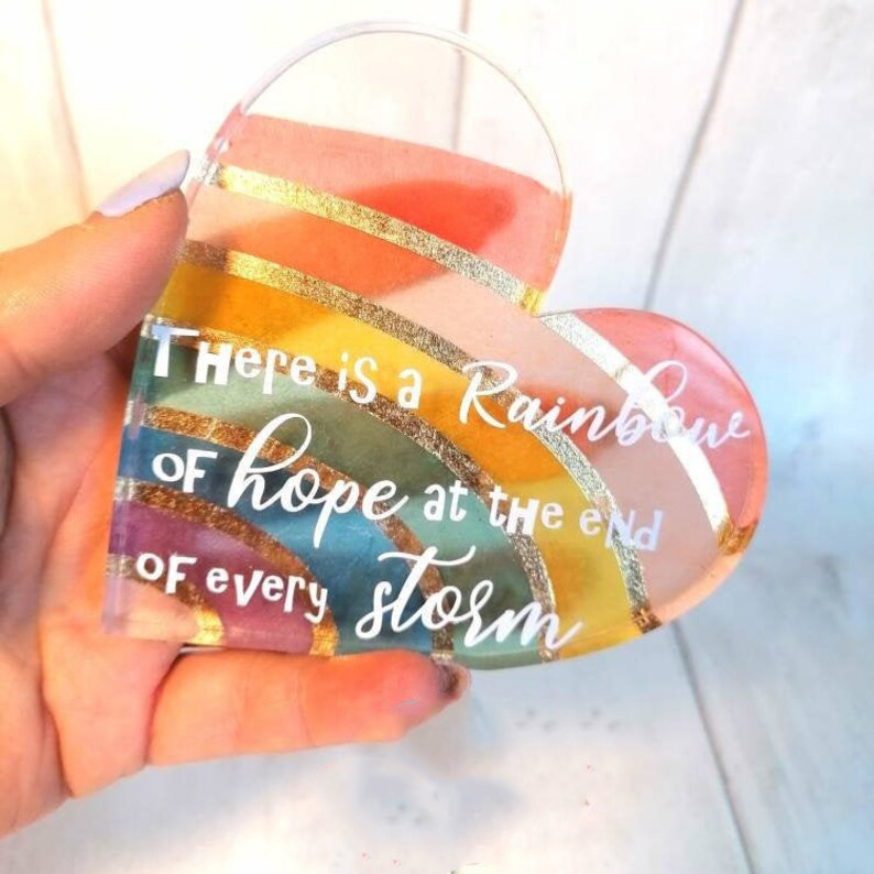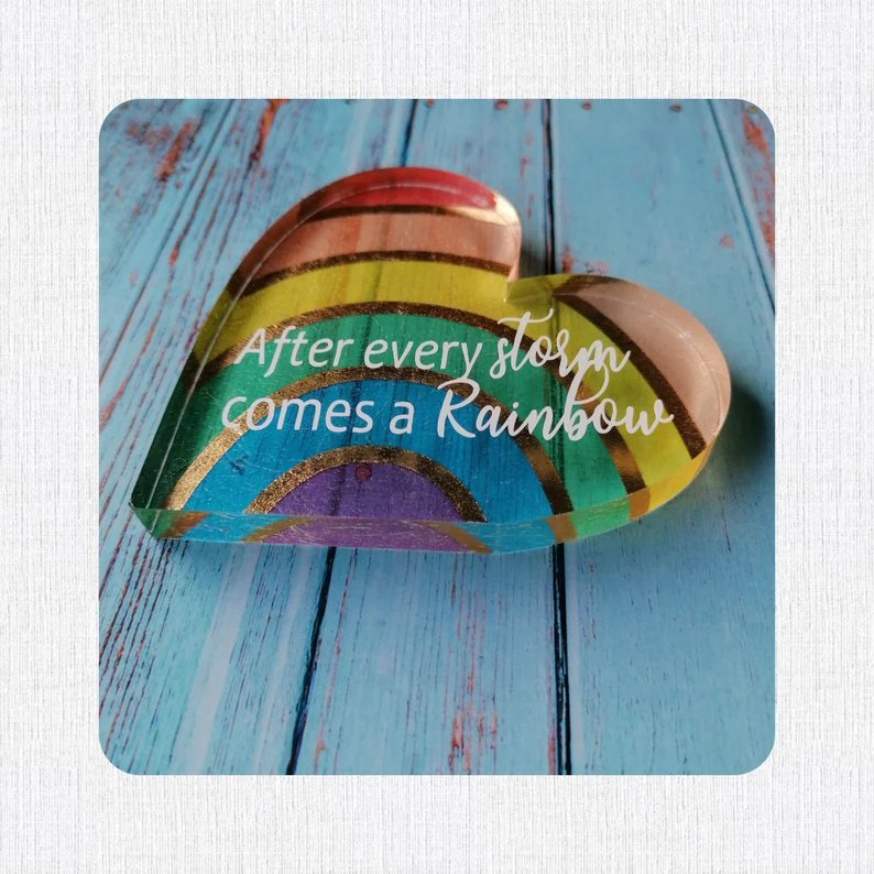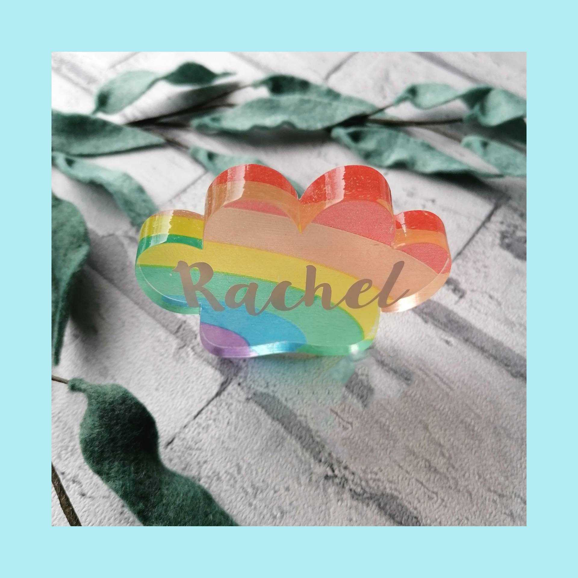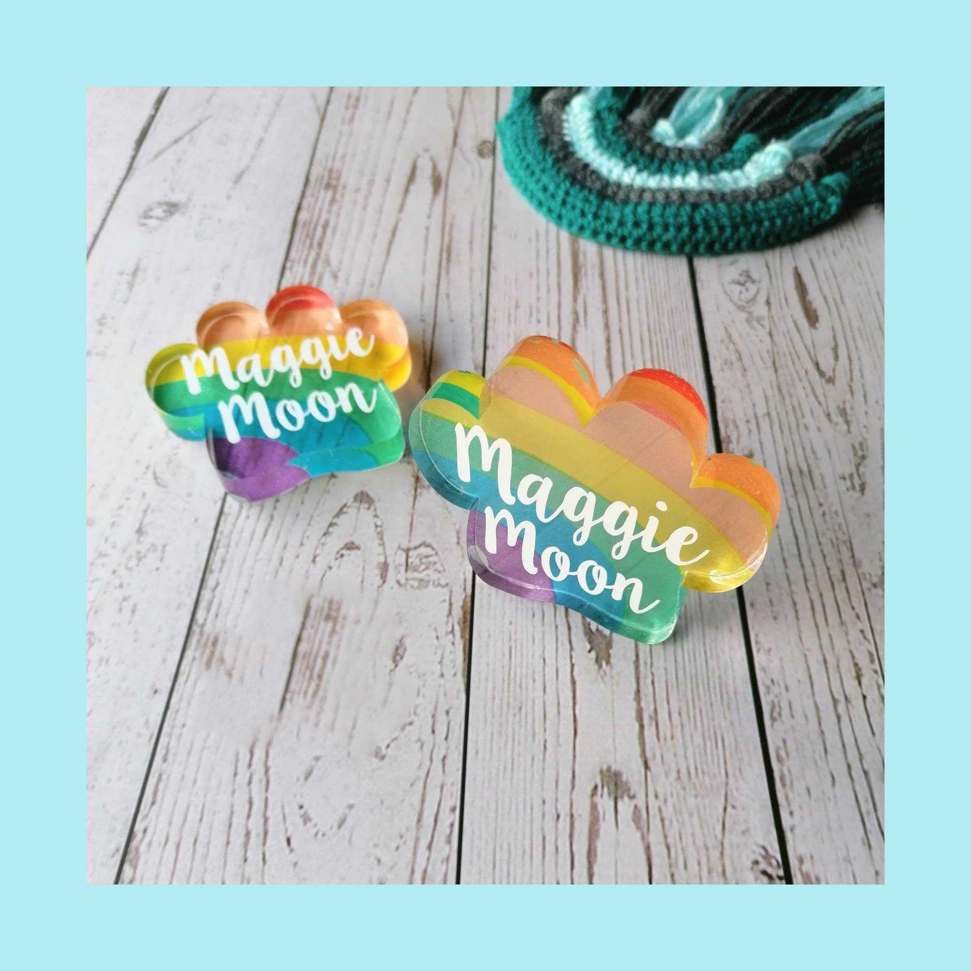 The paw is made from cast acrylic which will be reverse decoupaged with a rainbow paper and sealed with a gloss finish on the decoupage side for added protection. The pets name/s will then be cut from a gloss white vinyl and applied to the non decoupaged side. . Due to this being a decoupaged item, placement of the paper may differ as shown in the photos.